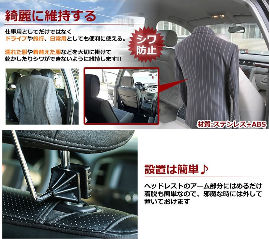 ヘッドレストのアーム部分にはめるだけ着脱も簡単なので、 邪魔な時には外して置いておけます ◆綺麗に維持する仕事用だけでなく、ドライブや旅行、 日常用としても使用できます濡れた服や着替えた上着をなどを 大切に掛けてシワを防止できます ※輸入品のため基本的に日本語説明書は付属しません。